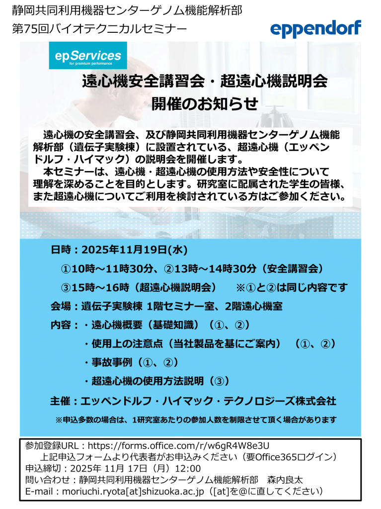 遠心機の安全講習会、及び静岡共同利用機器センターゲノム機能解析部(遺伝子実験棟)に設置されている、超遠心機(エッペンドルフ・ハイマック)の説明会を開催します。